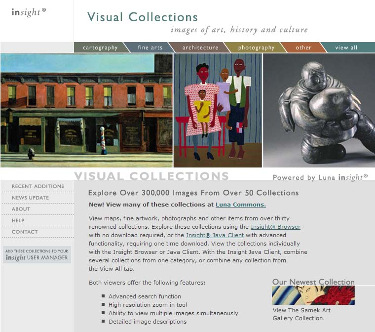 The Visual Collections site was established in 2004 as a central location for cultural collections in the Luna Insight software that were available free to the public. Over 300,000 images from over 50 collections have been made available here. In 2008, the establishment of LUNA Commons has largely superseded the need for the Visual Collections site, but it remains active until all the collections on it have been moved over to the LUNA Commons. Visual Collections uses the older Insight Browser and Java Client software, while LUNA Commons uses the new LUNA Browser software.