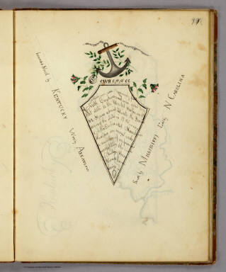 The diagram above accompanied a hand-drawn map of Connecticut, shown below. Of the 19 maps in her book, most were copied from the 1805 edition of Carey's American Pocket Atlas (see our 1796 edition, which is similar), except for Ohio, which is from Arrowsmith and Lewis' Atlas, 1812, and Indiana, from an unknown source.