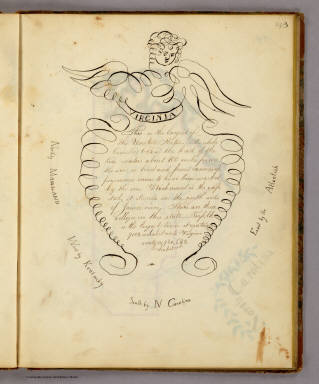 The geographical diagram of Connecticut below is from Frances A. Henshaw's Book of Penmanship Executed at the Middlebury Female Academy April 29, 1828. She drew geographical diagrams for each of her hand-drawn maps in her book. Notwithstanding the title, this geography book is drawn by a very promising student. It includes descriptions of Astronomical Geography, the Ptolemaic, Brahean and Copernican Systems, Comets, Great Circles, Equator, Meridian, Horizon, Colures, Tropics, Polar Circles, Zones, Climates, Latitude and Longitude, a section titled "America," and 19 maps of the states with a descriptive geographical diagram for each.