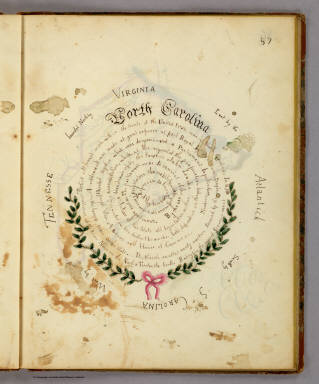 Maria Symonds of the Topsfield Academy in Topsfield, Massachusetts, made this map of the United States and dated it 1830. It bears a strong resemblance to John Melish's United States of 1822 (although the Melish map does not cover the West Coast). This is very well drawn, backed with linen and varnished, and outlined in color.