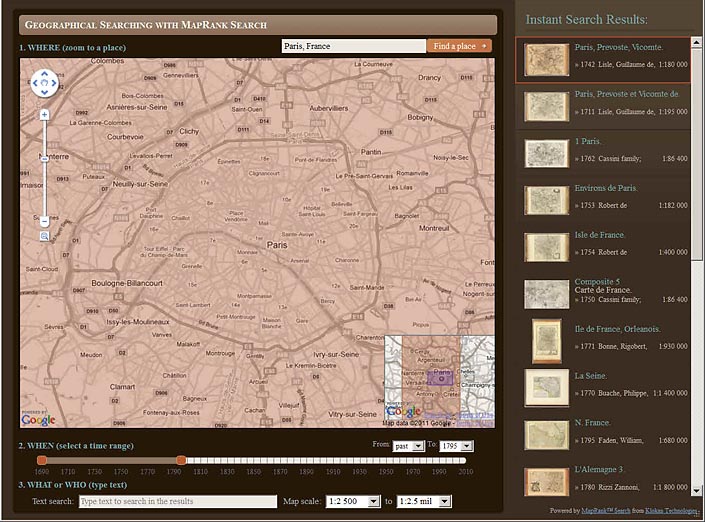 The WHAT or WHO box is used to further limit results to maps of Paris by Guillaume De Lisle: