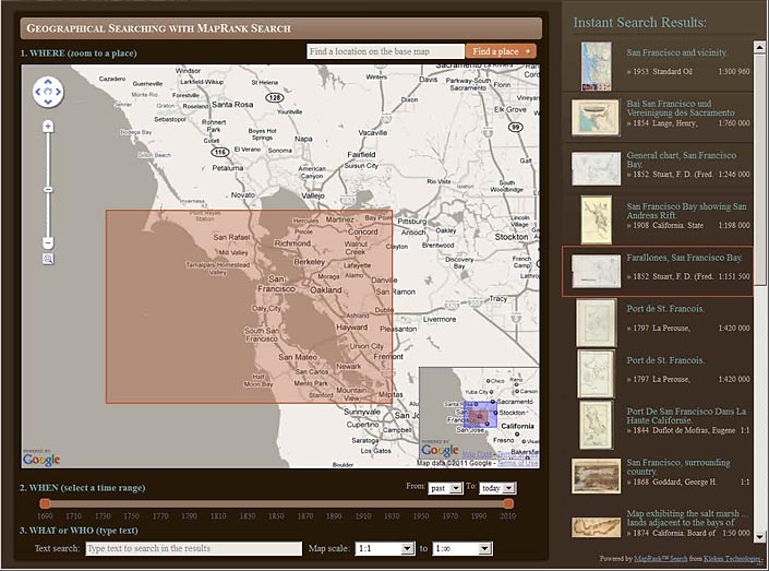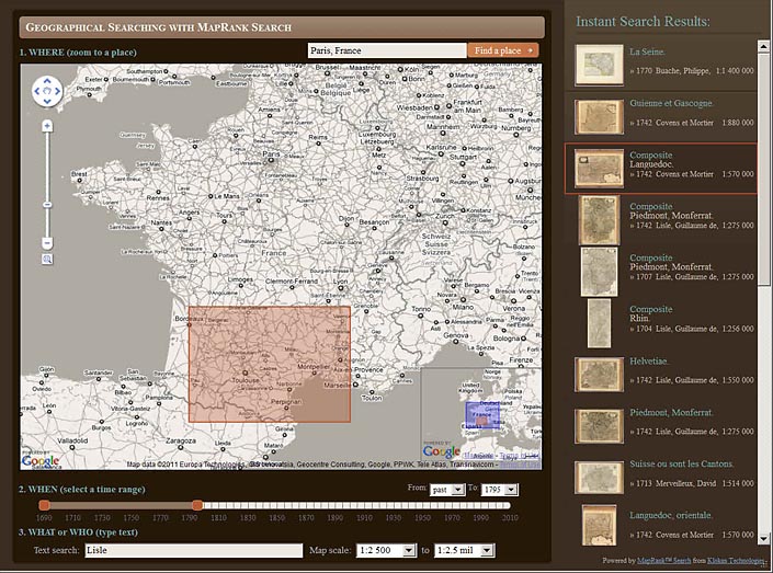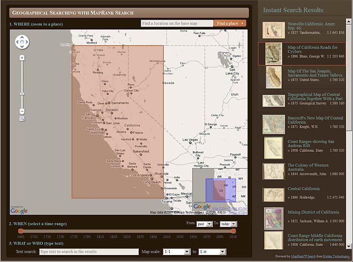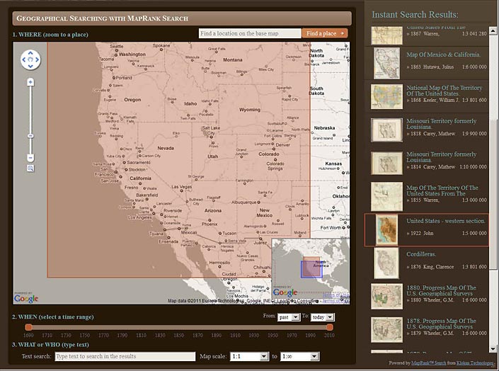 The new MapRank Search viewer enables geographical searching of the collection by map location and coverage, in a Google Map window. Pan and zoom the Google Map to the area of the world you want maps of, and the results will automatically appear as a scrollable list of maps with thumbnail images in the right side results window. The maps in the right side results list are ranked by coverage, with the maps that have coverage closest to your search window listed at the top. Maps lower in the list show the area of interest, but with coverage that does not match as closely. Mousing over any map in the list will show the map's coverage as a light red rectangle on top of the Google Map. Clicking on a map in the list will open it in the Luna Browser. You can filter your results with the When timeline, the What or Who keyword text window, and the Map scale windows, as well as search by place name in the Find a place window. Currently about 12,000 online maps are searchable with MapRank search; soon all the 27,000 online maps will be included. Launch MapRank Search.