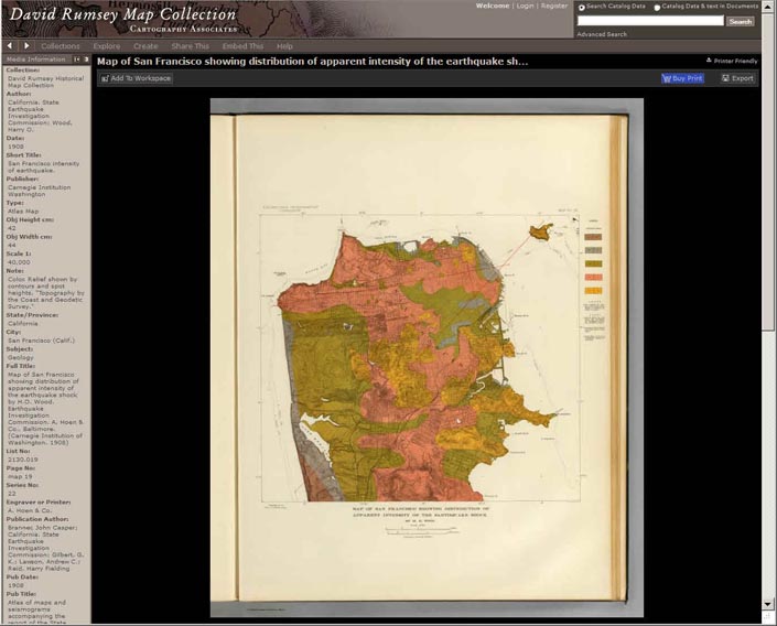 Below is the MapRank Search viewer zoomed in to find maps of San Francisco, with the 1904 "San Francisco Intensity of Earthquake" map highlighted in red in the results list and with the area covered by the earthquake map shown in light red on the Google Map: