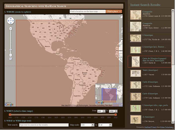 The WHEN time range line allows changing the dates of the results, here from 1690 to 1795 for the same set of World maps: