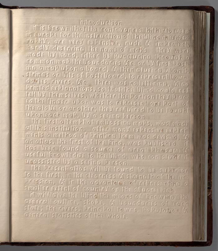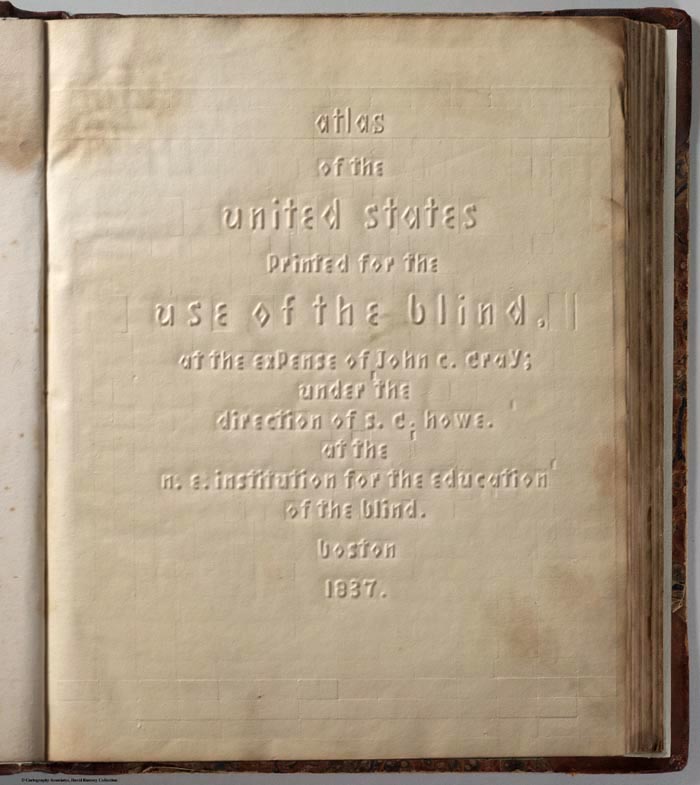 The Atlas of the United States Printed for the Use of the Blind was published in 1837 for children at the New England Institute for the Education of the Blind in Boston. Without a drop of ink in the book, the text and maps in this extraordinary atlas were embossed heavy paper with letters, lines, and symbols. To the best of our knowledge, this is the first atlas produced for the blind to read without the assistance of a sighted person. Braille was invented by 1825, but was not widely used until later. It represented letters well, but could not represent shapes and cartographic features. Samuel Gridley Howe (1801-1876) was the founder and president of the New England Institute (later known as the Perkins Institute) and produced the atlas with the assistance of John C. Cray and Samuel P. Ruggles. Howe was the husband of Julia Ward Howe, the American abolitionist and author of the U.S. Civil War song "The Battle Hymn of the Republic." He was a champion of people with disabilities and believed that blind youth could be taught geography through maps created with his special paper embossing process. In his introduction to the atlas Howe notes that crude attempts had been made to create maps for the blind, but they used primitive methods of creating relief and required the assistance of a sighted person. He claimed that his new embossing method was superior in all respects. Today, it is difficult to know how successful the atlas was, although there can be little doubt that these maps helped Howe's blind students visualize geography. We do know that 50 copies were made and five survive today, including this one. The atlas includes 24 state maps with a page of text describing each state and the symbols used on the maps. In our scans, we have lit the maps and text pages from one side to create shadows that reveal the embossing.
