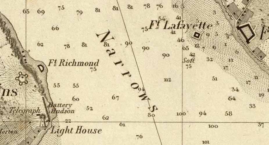 The present location of the Verrazano Narrows Bridge is show here in 1844 on the huge six sheet Map of New York Bay and Harbor, one of the first large chart maps produced by the United States Coast Survey.