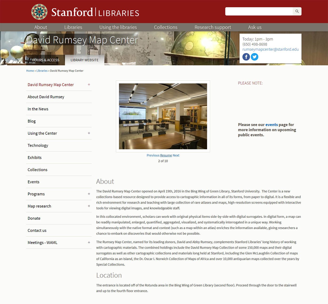 The David Rumsey Map Center at Stanford Library opened on April 19, 2016. It houses the entire David Rumsey Map Collection as well as a growing number of other collections: the Glen McLaughlin Collection of maps of California as an Island, the Dr. Oscar I. Norwich Collection of Maps of Africa and over 10,000 antiquarian maps collected over the years by Stanford Special Collections. The Rumsey Map Center is open to the public on weekdays from 1-5pm and weekday mornings by appointment. The Center is used for research, teaching, lectures, conferences, and exhibitions.